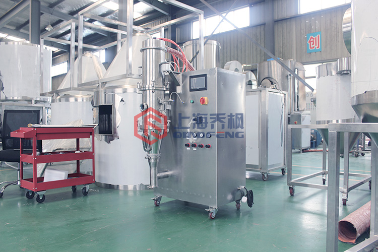 空氣經(jīng)加熱、凈化后,由引風(fēng)機(jī)從下部引入,經(jīng)漏斗的孔板篩板。在工作室內(nèi),通過(guò)攪拌和負(fù)壓形成流化。在快速蒸發(fā)后,水被廢氣帶走,材料很快干燥。