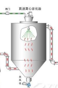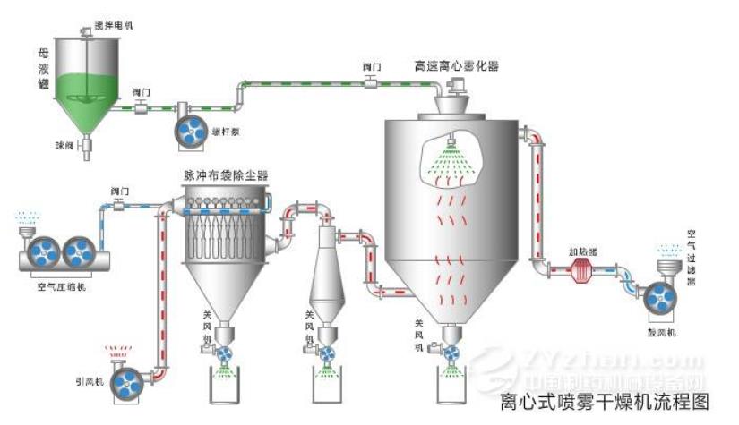 經(jīng)過過濾和加熱后,空氣進入干燥機頂部的空氣分配器,熱空氣以螺旋狀均勻進入干燥室。 物料液體通過塔身頂部的高速離心霧化器或高壓霧化器噴入非常細的霧狀液珠中,并且可以在很短的接觸時間內干燥成成品 與空氣平行。 成品從干燥塔和旋風分離器的底部連續(xù)輸出,細粉塵通過脈沖袋式集塵器收集,廢氣通過風扇排出。