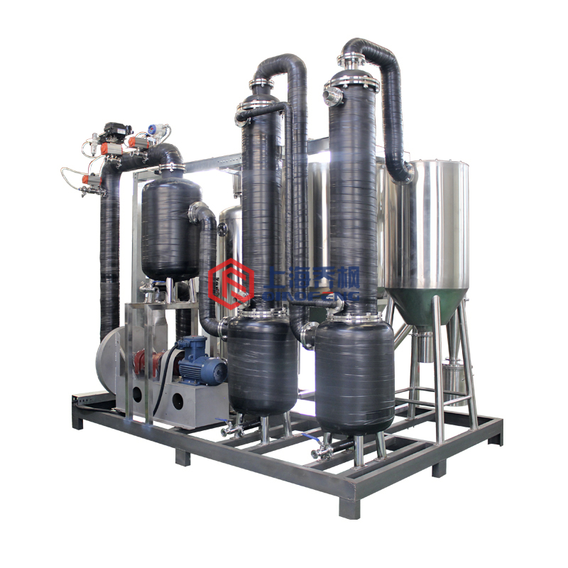 從干燥塔底部排出的氣體中含有粉料和有機(jī)溶劑蒸汽,采用過濾裝置進(jìn)行回收,將粉料和有機(jī)溶劑氣體進(jìn)行分離,粉料回收,有機(jī)氣體進(jìn)入冷凝器進(jìn)行回收并重復(fù)利用。